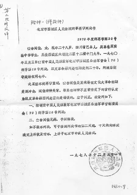 闻佳《再审判决书》的两次修改闻佳亲属对1978年12月北京市西城区人民法院的《再审判决书》未能一次接受,曾经交涉修改。下文是两次修改稿(闻林提供,其中复印件上标注“第一次修改件”、“第二次修改件”均为闻林字迹)。第一次修改件。《北京市西城区人民法院再审判决书》1978年度刑再字第20号被告闻佳,女,现年二十八岁,汉族,四川省巴县人。原系北京实验中学学生。住西城区六铺炕二区十二楼中门九号。一九七〇年三月五日由前中国人民解放军北京西城区公法军事委员会刑字第十号判决,以反革命罪判处有期徒刑二十年,刑满后剥夺政治权利七年。现经再审查明,被告闻佳的亲属在文化大革命初期被冲击,被告闻佳无人抚养,产生悲观厌世思想,在校曾绝食,后被发现,送往医院救治。在救治中被告交代有反动思想,但不构成反革命罪,原判对被告闻佳以现行反革命定罪,是错误的。兹依法改判如下:一,撤消前中国人民解放军北京西城区公法军事委员会(70)刑字第10号判决。二,宣告闻佳无罪,予以释放。如不服本判决,可于收到判决书的第二天起,十天内,向本院提出上诉状及副本。上诉于北京市西城区人民法院。北京市西城区人民法院(公章)一九七八年十二月三十一日